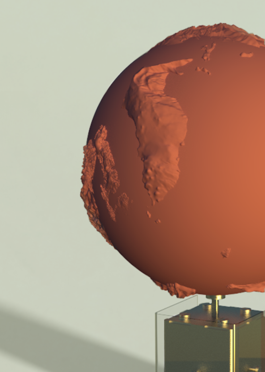 The story is illustrated on the clock through the shapes of islands, which exist and whose forms resemble specific characters in the narrative. Their placement and size on the globe is fictional and determined by the time at which each scene is meant to be seen. There is a bird-shaped island that marks noon, reminiscent of the cuckoo in a grandfather clock. At 5 o’clock, a spilled cup of tea appears, symbolizing traditional tea time. In the morning hours, an archipelago shaped like the smiley face in our cappuccino brings a gentle reminder of a fresh start.