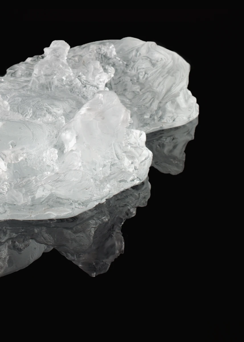 Kiln casted glass pedestals in a sculptural handmade mould process, then polished into a shiny glass surface.