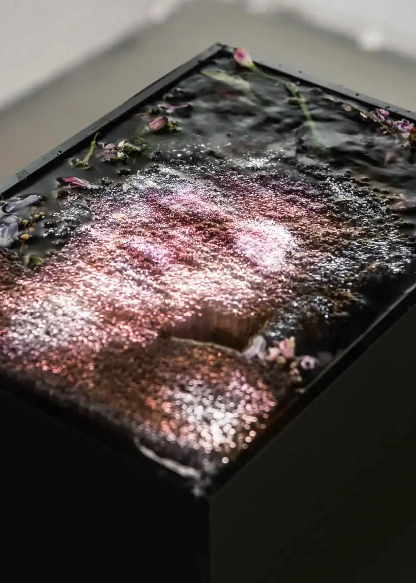 - Material: plexiglass, optical fibers, hydraulic turbine, electronics, LED illuminated image, water, flowers