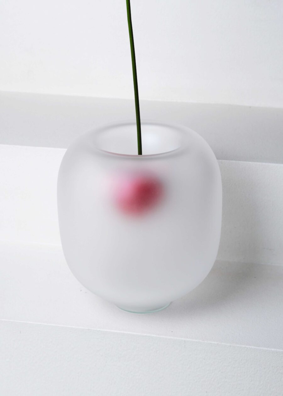 Indulge in the ethereal charm of this double-walled vase meticulously crafted from hand-blown glass. The captivating fiery red subtly radiates through the delicate crystal wall, creating an enchanting interplay of hues. Available in a diverse spectrum of colors, allowing you to customize and order according to your preference. The entirety of the vase is frosted, lending it an enigmatic dispersion of light.
