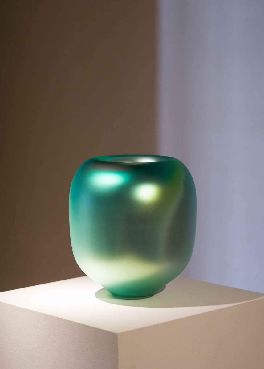 Vases inspired by reflections on scarab beetles. Created by combining multiple colors of glass and inner silvering, the individual colors blend softly into each other. Some pieces in this collection are sand-frosted, making their reflection more mysterious and less legible. The combination of frosting and silver creates a specific surface character, inimitable in any other material than glass. The collection is made of double-walled, hand-blown glass.